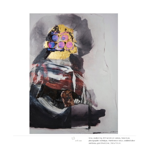 53 Groa, awakening, 2019 acrylic on canvas, metal dust, art now photographic technique, interference colour, oxidized silver and brass, gold 59x43.3 in. | 150 x110 cm.