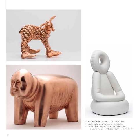 ESQUIMAL, 2014 RESIN 13,5X7,5X7,5 IN. | 35X20X20 CM. BAMBI , 2008 COPPER 7,5X7,5X5,5 IN. | 20X20X15 CM. COCHINO, 2014 COPPER 23,5X15,5X11,5 IN. | 60X40X30 CM. BOLSA BASURA, 2014 COPPER 31X31X29,5 IN. | 80X80X75 CM. 42
