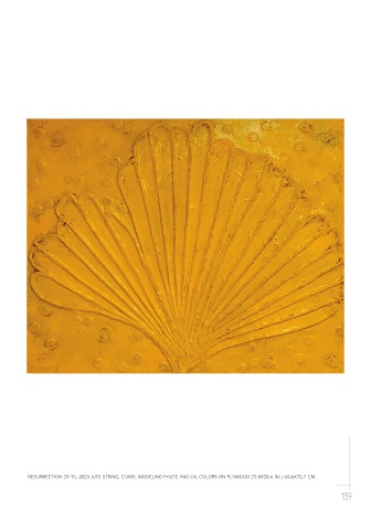 RESURRECTION 23-15, 2023 JUTE STRING, COINS, MODELING PASTE AND OIL COLORS ON PLYWOOD 23.8X28.6 IN. | 60.6X72.7 CM. 159