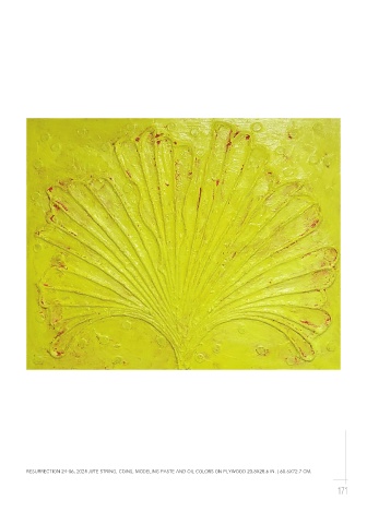 RESURRECTION 24-06, 2024 JUTE STRING, COINS, MODELING PASTE AND OIL COLORS ON PLYWOOD 23.8X28.6 IN. | 60.6X72.7 CM. 171